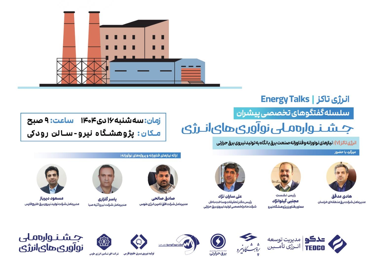 به گزارش روابط عمومی شرکت افق تأمین انرژی طوس، هفتمین انرژی تاکز (Energy Talks) از سلسله نشستهای تخصصی پیشران جشنواره ملی نوآوریهای انرژی با موضوع «نیازهای نوآورانه و فناورانه صنعت برق با نگاه به تولید نیروی برق حرارتی» روز سهشنبه ۱۶ دی ۱۴۰۴، ساعت ۹